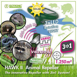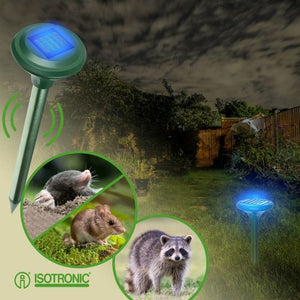 Protejează-ți grădina de cartițe, șerpi și rozătoare fără a le răni! Funcționează pe ultrasunete și este alimentat solar pentru o utilizare ecologică.